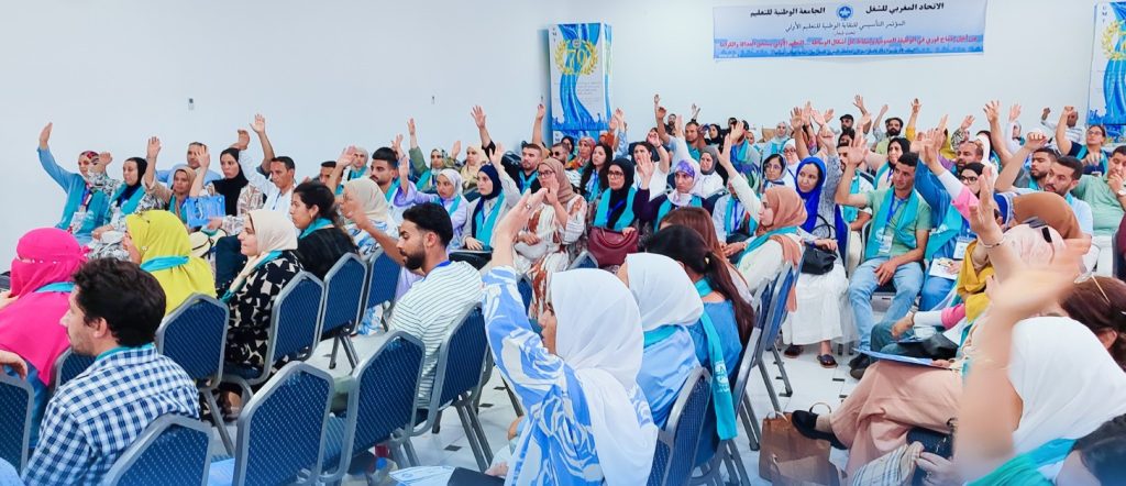 وأعلن المؤتمر في بيانه الختامي عن تشبثه بالاتحاد المغربي للشغل كإطار نقابي مستقل، ودعا إلى تحسين الأوضاع المهنية والاجتماعية والمادية للعاملين بالقطاع، كما أدان ما وصفه بـ “النهب العلني” الذي تمارسه بعض الجمعيات المحلية، مطالبا وزارة التربية الوطنية بالتدخل العاجل لإيقافها.